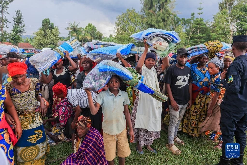 5月4日,災(zāi)民在盧旺達(dá)西方省領(lǐng)取賑災(zāi)物資。