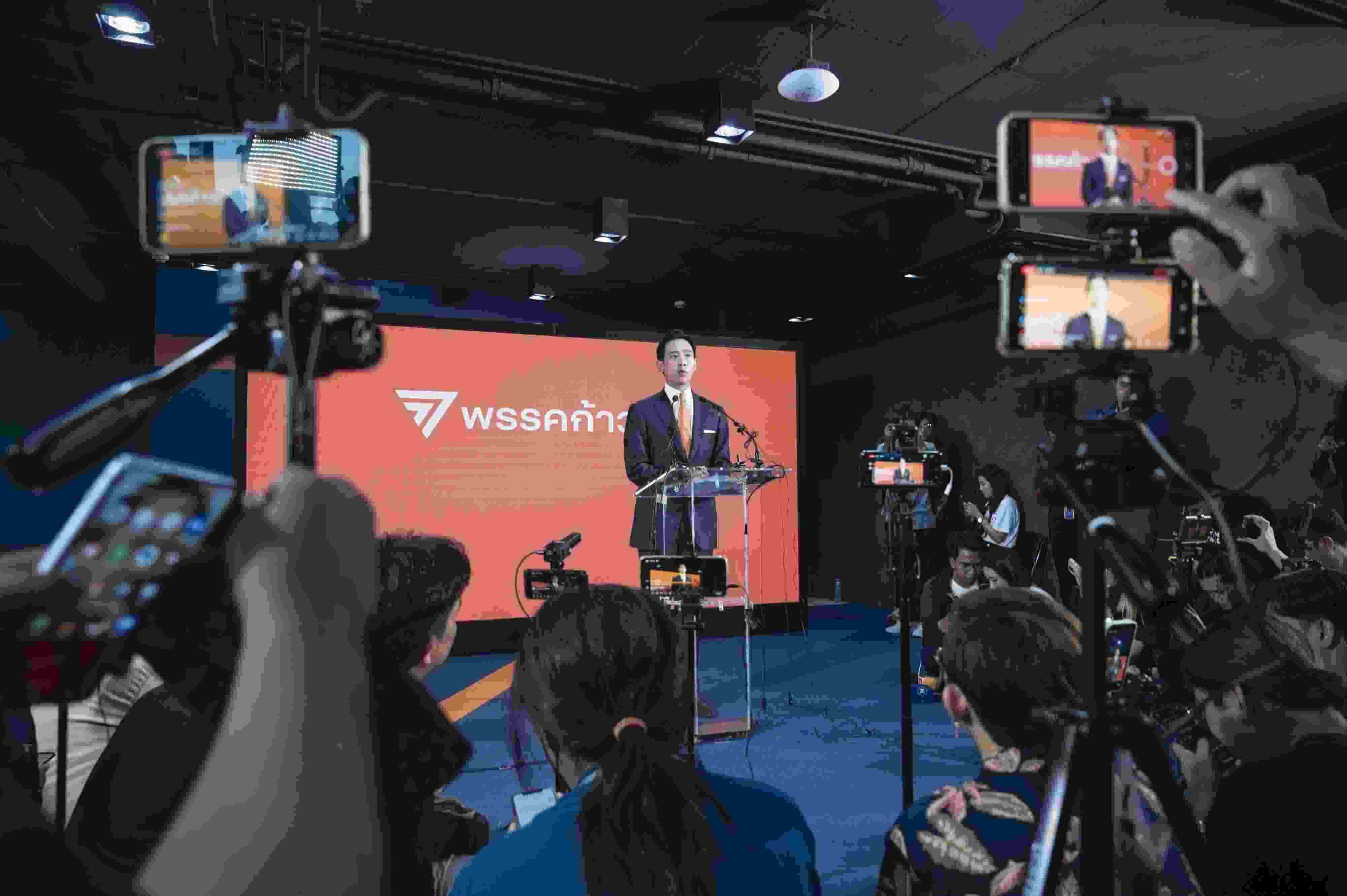 當?shù)貢r間2023年5月15日,泰國曼谷,泰國遠進黨黨魁皮塔在該黨總部舉行記者招待會。當日中午,在泰國國會下議院選舉中獲得選票數(shù)和下議院席位數(shù)暫時領(lǐng)先的遠進黨黨魁皮塔宣布遠進黨在此次選舉中獲勝,已經(jīng)做好組建新一屆政府的準備,自己也已準備好擔(dān)任總理一職。 視覺中國