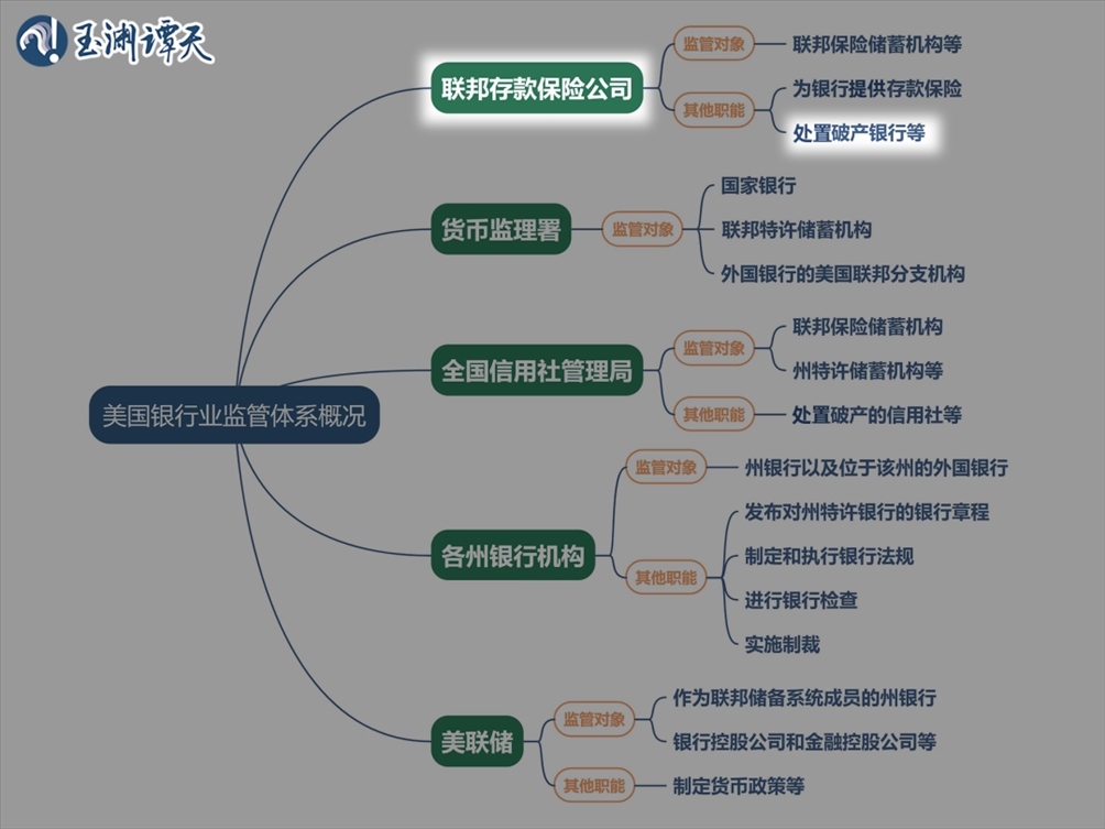 上圖是美國(guó)聯(lián)邦銀行業(yè)監(jiān)管體系的主要部門(mén),可以看到,這個(gè)監(jiān)管體系覆蓋美國(guó)銀行業(yè)的上中下游,而FDIC職責(zé)之一是處置美國(guó)破產(chǎn)銀行。