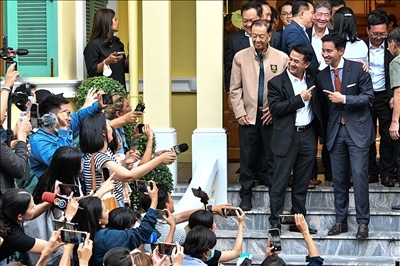 當(dāng)?shù)貢r(shí)間2023年5月17日,泰國(guó)曼谷,泰國(guó)遠(yuǎn)進(jìn)黨黨魁皮塔與泰國(guó)為泰黨黨魁春拉南在與聯(lián)盟伙伴舉行會(huì)議后合影。