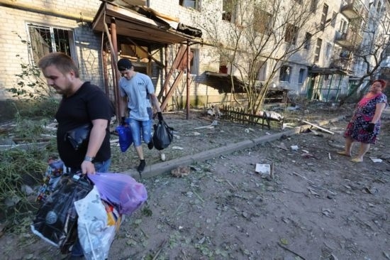 2022年6月20日,頓涅茨克當(dāng)?shù)鼐用駨谋粨p壞的建筑撤離。新華社發(fā)(維克托攝)