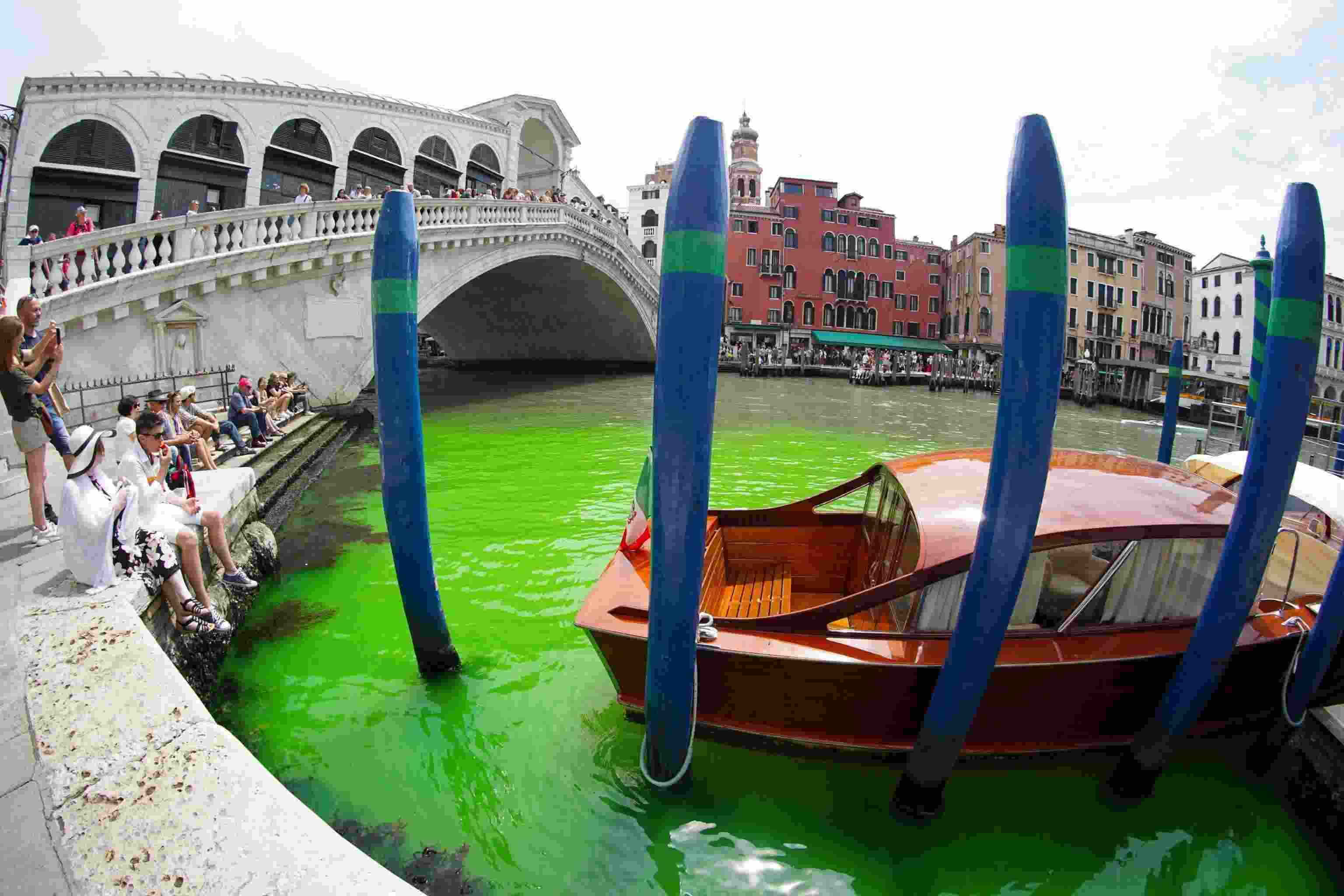 當(dāng)?shù)貢r(shí)間2023年5月28日,意大利威尼斯大運(yùn)河里亞托橋附近水域變成了熒光綠的顏色,警方等部門已經(jīng)介入調(diào)查,尋找原因。 視覺中國