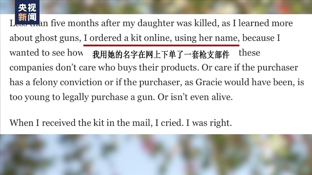 “幽靈槍”校園槍擊案幸存者 米婭·特雷塔:當(dāng)時(shí)我們正在談笑,突然聽見“砰”的一聲槍響,當(dāng)?shù)诙晿屄曧懫饡r(shí)我已經(jīng)跌倒在地上。我爬起來,跑進(jìn)教室里,同學(xué)和老師急忙為我止血,我被一名不認(rèn)識(shí)的同校學(xué)生,同時(shí)也是一個(gè)未成年人,用一把點(diǎn)45口徑的“幽靈槍”擊中了。