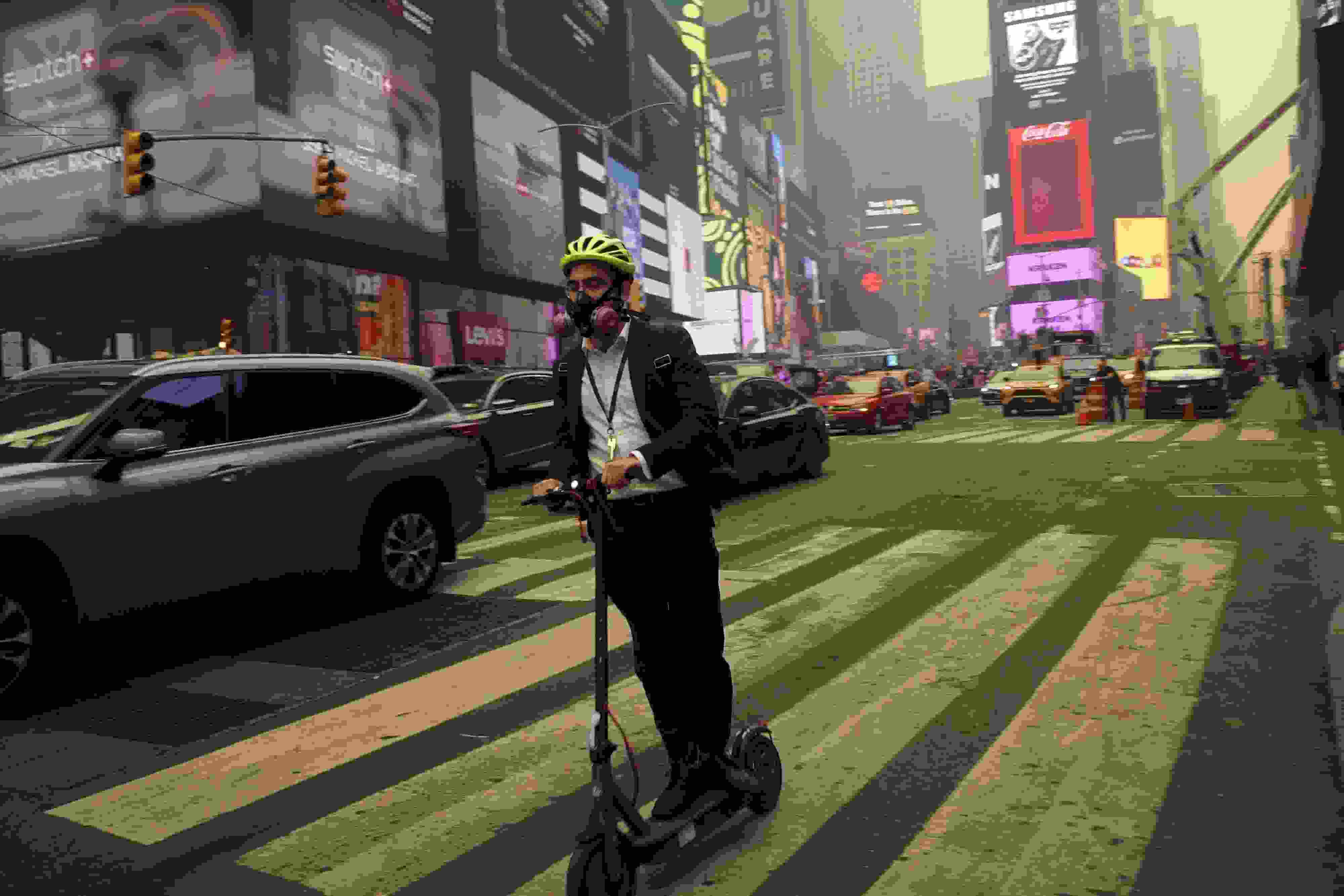 當地時間6月7日,美國紐約時報廣場的一位騎行者佩戴著呼吸過濾器。近日,加拿大野火產生的煙霧蔓延至美國,紐約市出現霧霾,戶外民眾嚴密防護。 視覺中國