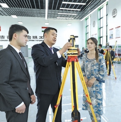 4月12日,在塔吉克斯坦首都杜尚別的魯班工坊內(nèi),來自天津城市建設(shè)管理職業(yè)技術(shù)學(xué)院的老師吳正鵬(左二)向?qū)W生講解測(cè)繪儀器使用方法。奧斯帕諾夫攝(新華社發(fā))