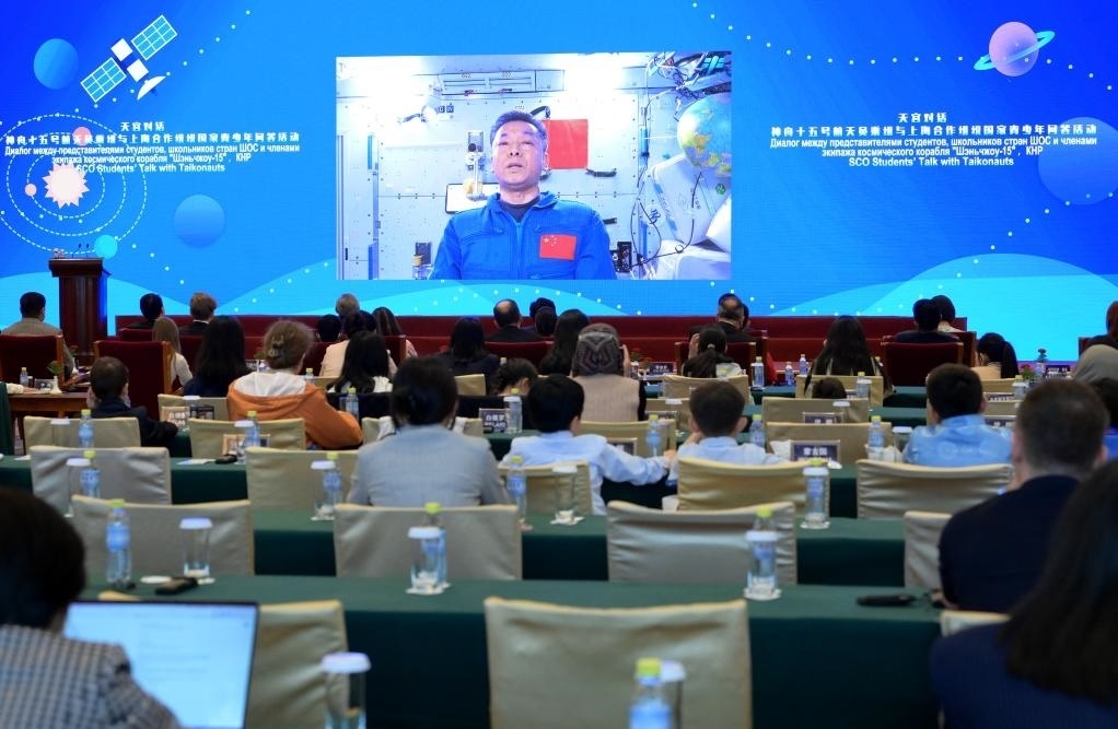 4月20日,神舟十五號(hào)航天員通過(guò)視頻屏幕回答上海合作組織國(guó)家青少年的提問(wèn)。新華社記者 李賀 攝