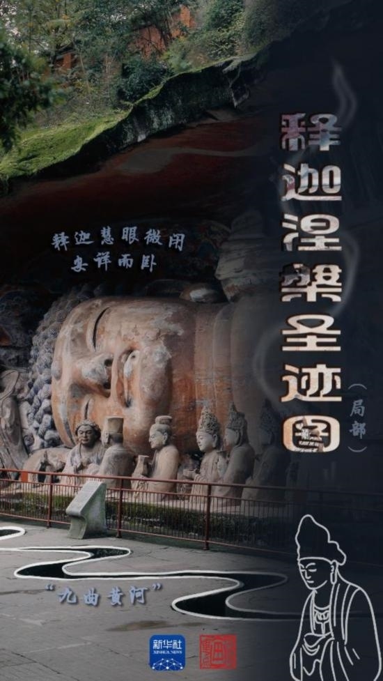 釋迦涅槃圣跡圖龕高7米、寬32米、深5米,刻像37尊。釋迦慧眼微閉,安詳而臥。佛像雙腳隱入巖際,右肩陷于地下,以有限的畫面表現(xiàn)了無限的藝術形象。
