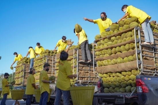 2021年5月30日,在重慶洪九果品股份有限公司位于泰國(guó)尖竹汶府的工廠內(nèi),工作人員在裝運(yùn)即將銷往中國(guó)的榴蓮。新華社發(fā)