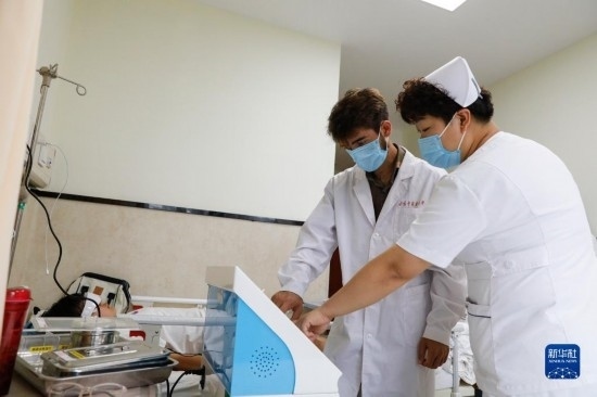 甘肅中醫(yī)藥大學(xué)針灸推拿專業(yè)的塔吉克斯坦留學(xué)生紀(jì)明哲(左)在老師的指導(dǎo)下學(xué)習(xí)直流電離子機(jī)器操作(7月27日攝)。新華社記者 陳斌 攝