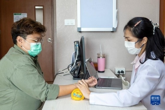 7月21日,在泰國(guó)曼谷岐黃泰國(guó)中醫(yī)藥中心,一名醫(yī)生在為患者診脈。新華社記者 林昊 攝
