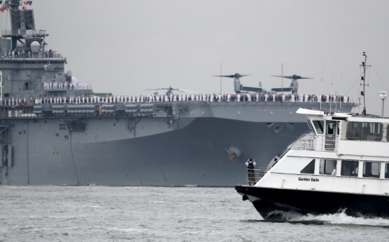 2017年5月24日,在美國紐約,美國海軍“基薩奇”號兩棲攻擊艦參加紐約艦隊周艦船巡游活動。新華社記者王迎攝