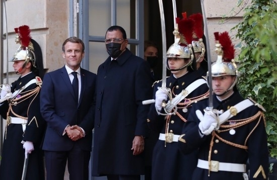 2021年11月12日,在位于法國(guó)巴黎的峰會(huì)會(huì)場(chǎng),法國(guó)總統(tǒng)馬克龍(左二)歡迎尼日爾總統(tǒng)巴祖姆(左三)。新華社記者高靜攝