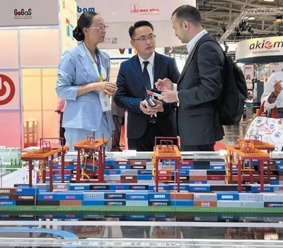 在2023年慕尼黑國際物流博覽會上,工作人員在中鐵集裝箱運(yùn)輸有限公司展臺前向國外客戶介紹廣州國際港中歐班列站點(diǎn)設(shè)施。本報(bào)記者 李 強(qiáng)攝