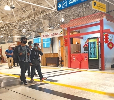 旅客經(jīng)過埃塞俄比亞博萊國際機(jī)場內(nèi)的中文服務(wù)臺。本報記者 萬 宇攝