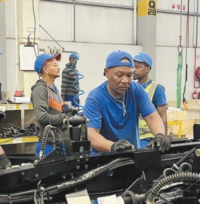中國第一汽車集團有限公司南非庫哈工廠生產(chǎn)線上,當?shù)貑T工在組裝車輛。本報記者 鄒 松攝
