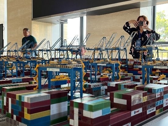 考察團(tuán)成員拍照記錄青島港全自動(dòng)化碼頭布局