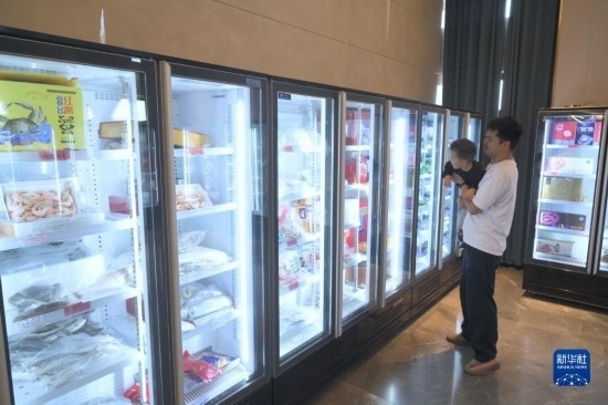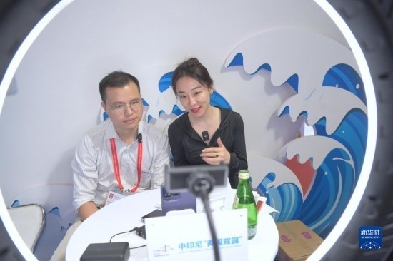 工作人員在第二十三屆中國國際投資貿(mào)易洽談會中印尼“兩國雙園”展位開展直播活動(9月9日攝)。