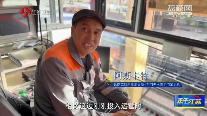 今年40多歲的阿斯卡特,正在十幾米的高空熟練操縱著巨型龍門(mén)吊,將剛剛抵港的集裝箱吊上新車(chē)板。十年前,無(wú)水港剛剛落成的時(shí)候,有著換裝工作經(jīng)驗(yàn)的阿斯卡特就被招募過(guò)來(lái)。他見(jiàn)證著這里因?yàn)橹袣W班列不斷興旺,從無(wú)人區(qū)成為口岸新城,基地里也從最初的五六個(gè)當(dāng)?shù)厝说浆F(xiàn)在有了180多個(gè)同事。通過(guò)不斷學(xué)習(xí),阿斯卡特如今拿到了巨型龍門(mén)吊操作證。忙碌的時(shí)候,他幾乎全天待在這個(gè)小小的操作間里,每天裝卸200個(gè)集裝箱。