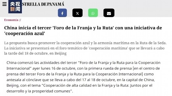 第三屆“一帶一路”國際合作高峰論壇也受到多國主流媒體關(guān)注。巴拿馬歷史最悠久,全國發(fā)行量最大的日?qǐng)?bào)之一《巴拿馬星報(bào)》刊發(fā)了主題報(bào)道,聚焦高峰論壇發(fā)布的《“一帶一路”藍(lán)色合作倡議》,并評(píng)論稱這一倡議體現(xiàn)了中國對(duì)于高質(zhì)量推進(jìn)“一帶一路”海洋合作的高度重視。