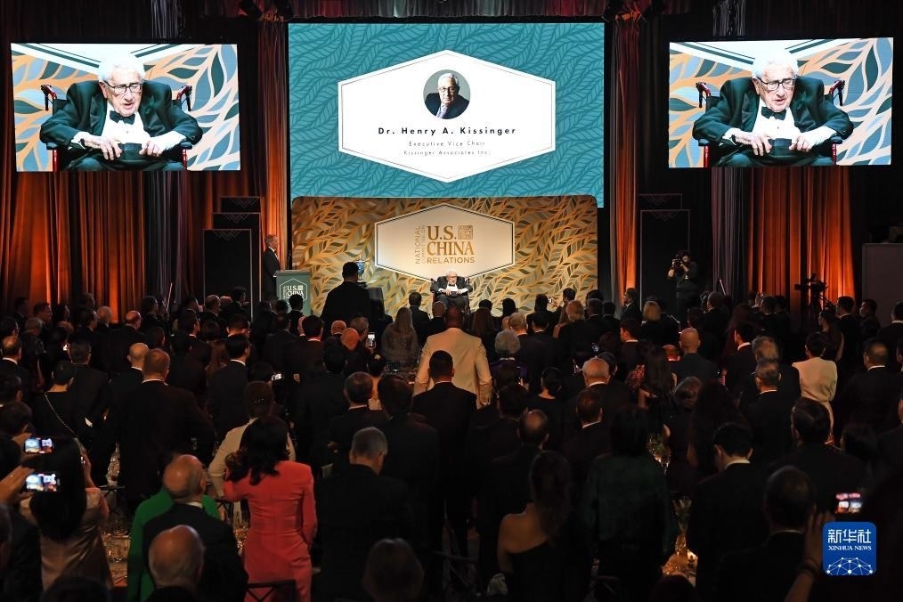 10月24日,美國前國務(wù)卿基辛格(中)出席在紐約舉行的美中關(guān)系全國委員會(huì)年度頒獎(jiǎng)晚宴。新華社記者 李睿 攝