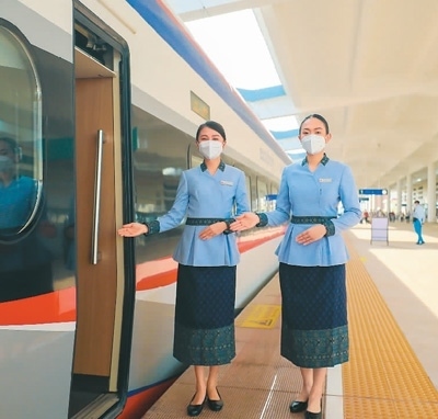 在中老鐵路老撾萬(wàn)象站,中老方乘務(wù)員按照中國(guó)鐵路乘務(wù)標(biāo)準(zhǔn),迎接世界各國(guó)旅客。