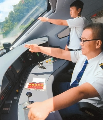 中方司機(jī)與老方副司機(jī)一同值乘“瀾滄號(hào)”國(guó)際旅客列車。