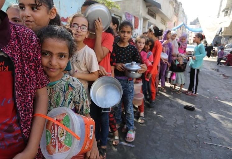 11月9日,在加沙地帶南部城市拉法,人們?cè)谝粋€(gè)臨時(shí)分發(fā)點(diǎn)排隊(duì)領(lǐng)取食物。新華社發(fā)(哈立德·奧馬爾攝)