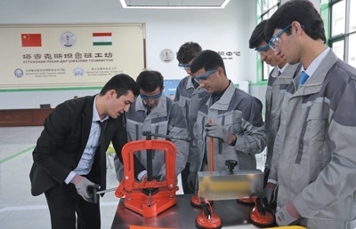 2022年,中亞地區(qū)首家魯班工坊在塔吉克斯坦啟動運營,為塔吉克斯坦開展職業(yè)培訓(xùn)作出了積極貢獻。圖為今年4月,在塔吉克斯坦魯班工坊,塔方教授向?qū)W生介紹中方捐贈的設(shè)備。