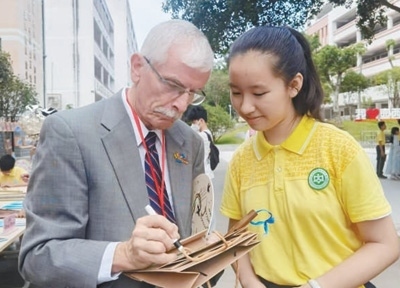 飛虎隊老兵后人蘭迪·斯科特為廣西柳州市壺西實驗中學(xué)學(xué)生留言。本報記者 祝佳祺攝