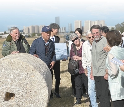 在云南昆明呈貢機(jī)場舊址,代表團(tuán)一行聆聽講解員講述石碾背后的故事。呈貢機(jī)場曾是飛虎隊在昆明的主要基地之一,機(jī)場建設(shè)期間,當(dāng)?shù)厝嗣窭瓌泳薮笫肫秸艿?,付出艱苦努力。本報記者 劉玲玲攝