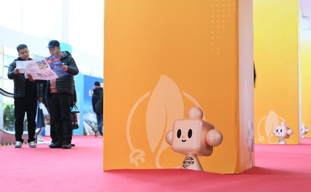 ?11月29日,通往鏈博會(huì)會(huì)場(chǎng)通道處的立柱上帶有醒目底色的“鏈氪”形象標(biāo)識(shí)引導(dǎo)參觀人群。新華社記者 李賀 攝