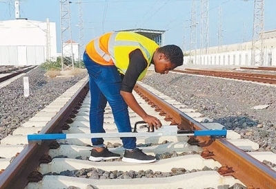 奧斯曼在亞吉鐵路的一座車(chē)站進(jìn)行巡檢。中國(guó)土木工程集團(tuán)吉布提有限公司供圖