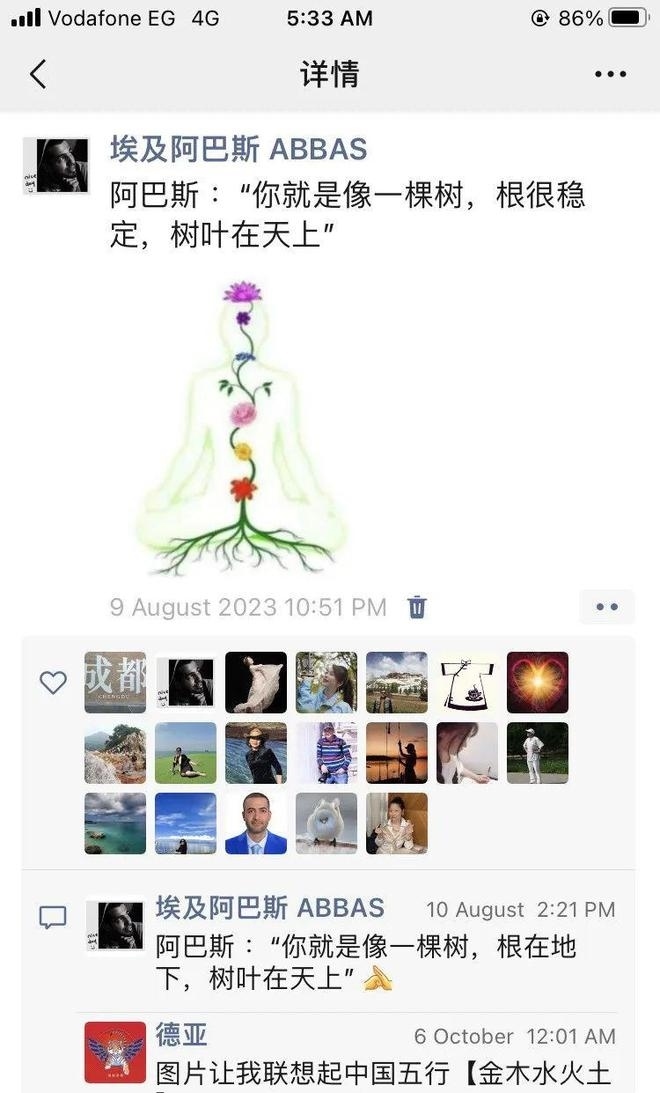 “你就是像一棵樹,根很穩(wěn)定,樹葉在天上?!边@是阿巴斯微信朋友圈里的一句話,也是他生活和工作的寫照。那深入泥土的遒勁的“根”,是他對中文和中國文化的不斷深入學(xué)習(xí),是不斷發(fā)展的中埃友誼,是不斷走深走實的共建“一帶一路”倡議;那姿態(tài)昂揚、伸向天空的輕盈的“葉”,是他由“小我”走向“大我”穩(wěn)步實現(xiàn)的夢想,是他對更美好明天的熱切期待。