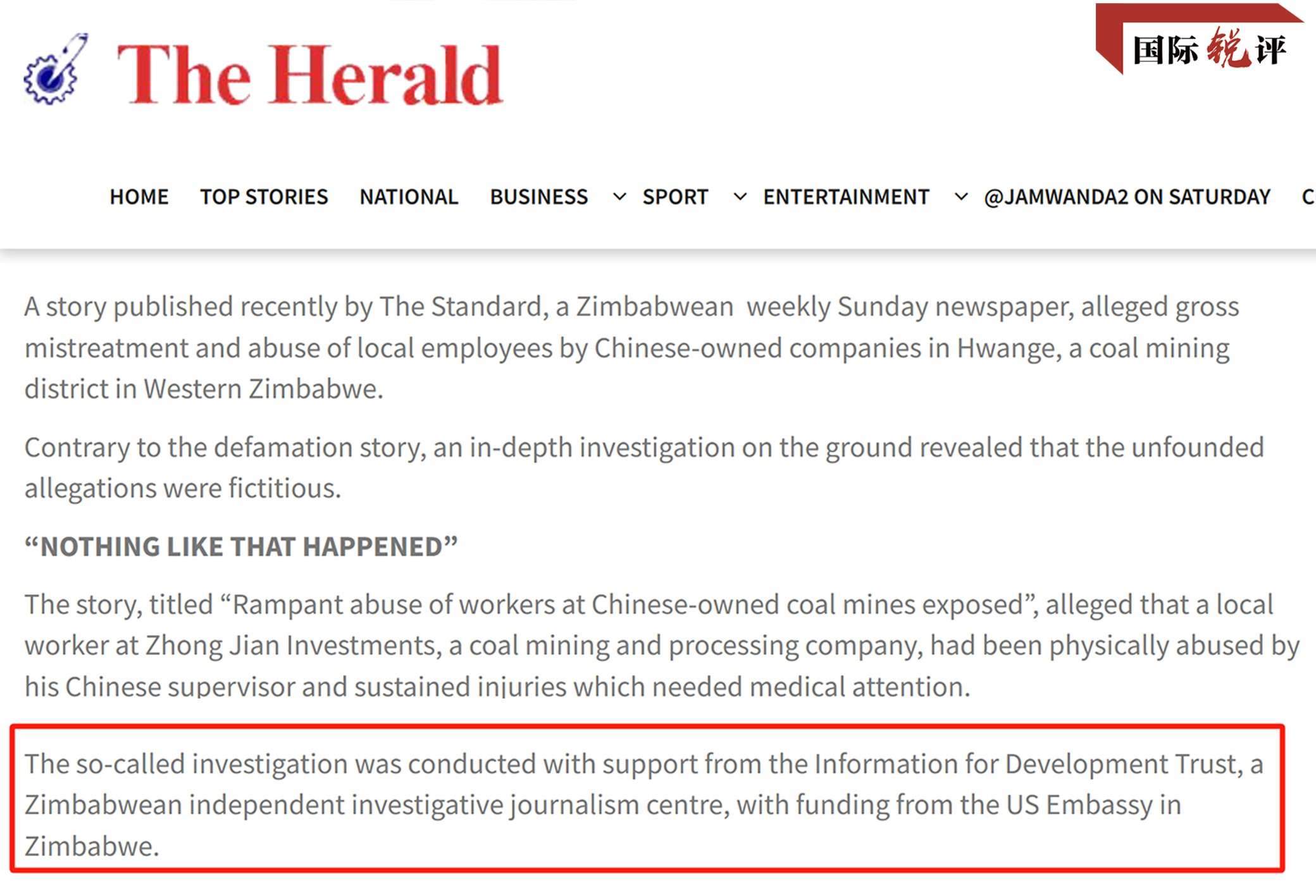 2022年5月,津巴布韋媒體《標(biāo)準(zhǔn)報(bào)》發(fā)布了一篇報(bào)道,污蔑中國礦企虐待當(dāng)?shù)貑T工,稱這名員工“受傷送醫(yī),還被解雇了”。這家媒體稱,報(bào)道是和津巴布韋一個(gè)名叫“信息促進(jìn)發(fā)展信托基金(IDT)”的機(jī)構(gòu)合作完成的。然而很快,津巴布韋《先驅(qū)報(bào)》就發(fā)文,用大量事實(shí)證明,這名員工只是和中方員工發(fā)生了小口角,并沒有被毆打,也沒有被解雇。