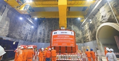 2023年6月10日,工人在巴基斯坦蘇吉吉納里水電站吊裝最后一臺(tái)機(jī)組轉(zhuǎn)子。中國(guó)能建葛洲壩海投公司供圖