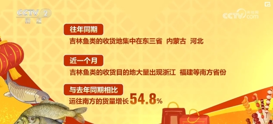 南方水果運(yùn)往北方的同時(shí),北方的堅(jiān)果、水產(chǎn)和鮮奶運(yùn)送到了南方。從訂單數(shù)據(jù)看,吉林魚類的收貨地在往年都集中在東三省、內(nèi)蒙古、河北。然而在最近一個(gè)月,收貨的目的地大量出現(xiàn)了浙江、福建等南方省份,跟2023年同期相比,運(yùn)往南方的貨量增長(zhǎng)了54.8%。