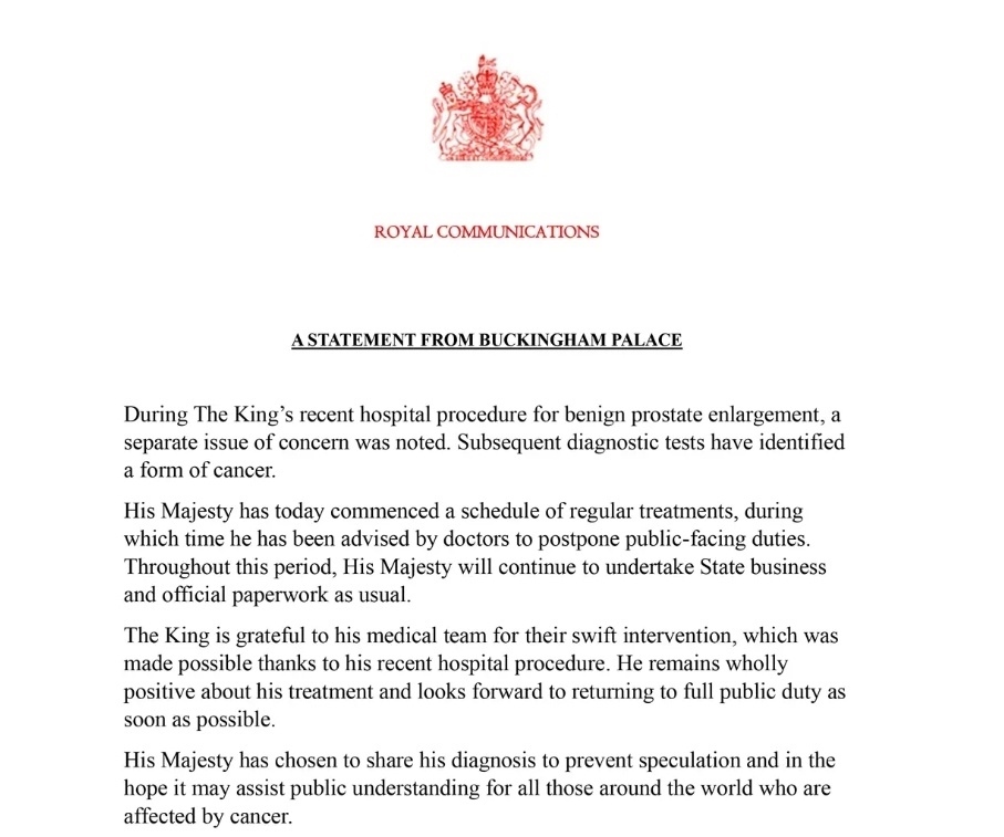 當?shù)貢r間2月5日,白金漢宮發(fā)布消息稱,英國國王查爾斯三世在醫(yī)院的診斷檢查中被確診患有癌癥。