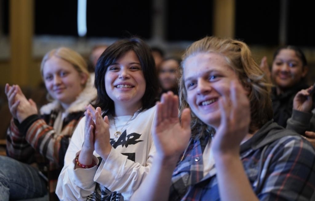 1月30日,在美國(guó)華盛頓州塔科馬市林肯中學(xué),將于3月啟程赴華交流的林肯中學(xué)12年級(jí)學(xué)生蒙特塞拉特·羅梅羅-羅查(中)參加美國(guó)中學(xué)生赴華交流歡送儀式。新華社記者 吳曉凌 攝