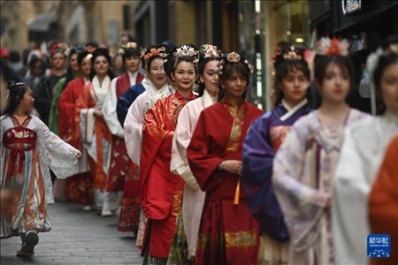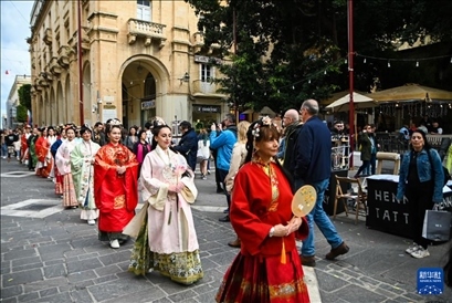 馬耳他民眾和當(dāng)?shù)赜慰?7日在地中海古城瓦萊塔的街道上欣賞到一場(chǎng)美妙的“漢服秀”。20多名中外女性漢服愛(ài)好者身著漢服,或手持團(tuán)扇,或提著宮燈,在地中海的微風(fēng)中款款而行。