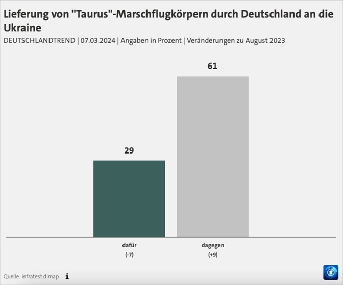 根據(jù)德國(guó)電視一臺(tái)當(dāng)?shù)貢r(shí)間7日公布的最新“德國(guó)趨勢(shì)”民調(diào),在“竊聽門”事件發(fā)生后,61%的德國(guó)民眾反對(duì)向?yàn)蹩颂m提供“金牛座”巡航導(dǎo)彈,較去年8月的民調(diào)結(jié)果增長(zhǎng)了9%;支持的民眾數(shù)量減少了7%,占比僅為29%。民調(diào)還顯示,70%的受訪者擔(dān)心間諜活動(dòng)增加,67%的人擔(dān)心德國(guó)對(duì)此缺乏準(zhǔn)備,還有62%的民眾擔(dān)心德國(guó)可能會(huì)直接卷入戰(zhàn)爭(zhēng)。