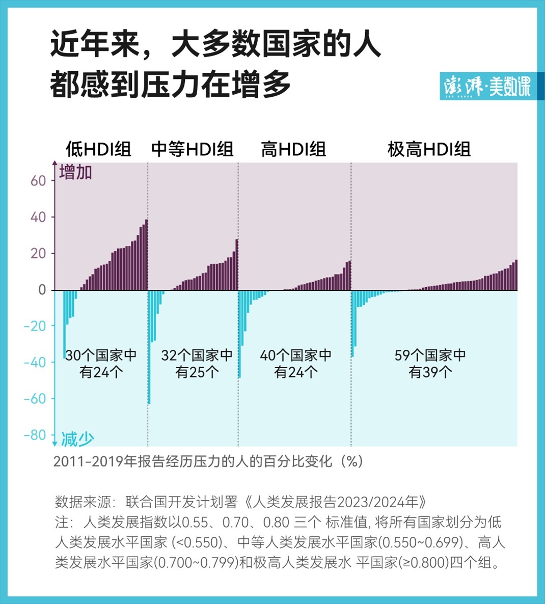 但其中低人類(lèi)發(fā)展水平組、中人類(lèi)發(fā)展水平組中,有約 80% 的國(guó)家個(gè)人壓力上升,且上升幅度較大,而高人類(lèi)發(fā)展水平組和極高人類(lèi)發(fā)展水平組的個(gè)人壓力上升幅度相對(duì)較小,這意味著欠發(fā)達(dá)國(guó)家的居民將面臨更大的壓力。
