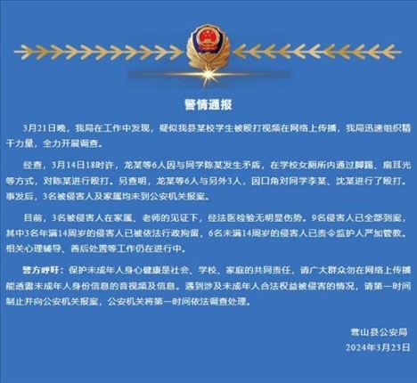 ·四川營山通報(bào)一女生遭同學(xué)毆打:9名侵害人全部到案。