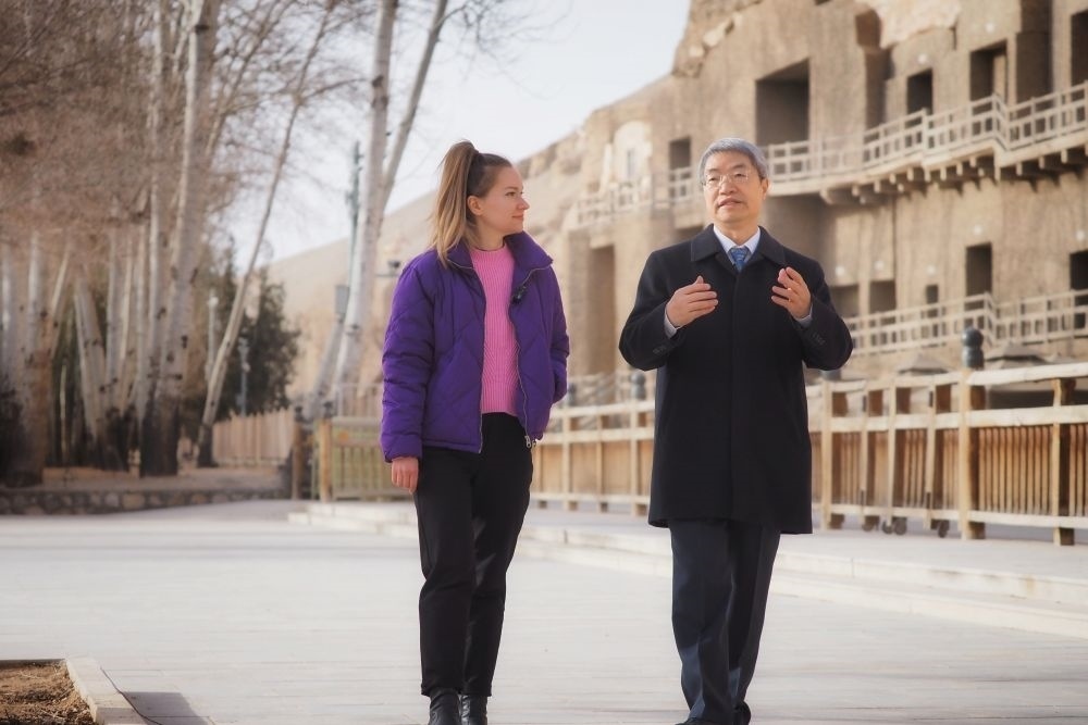 3月16日,新華社外籍記者達(dá)莎在莫高窟前同敦煌研究院黨委書(shū)記趙聲良交流。新華社記者趙宇攝