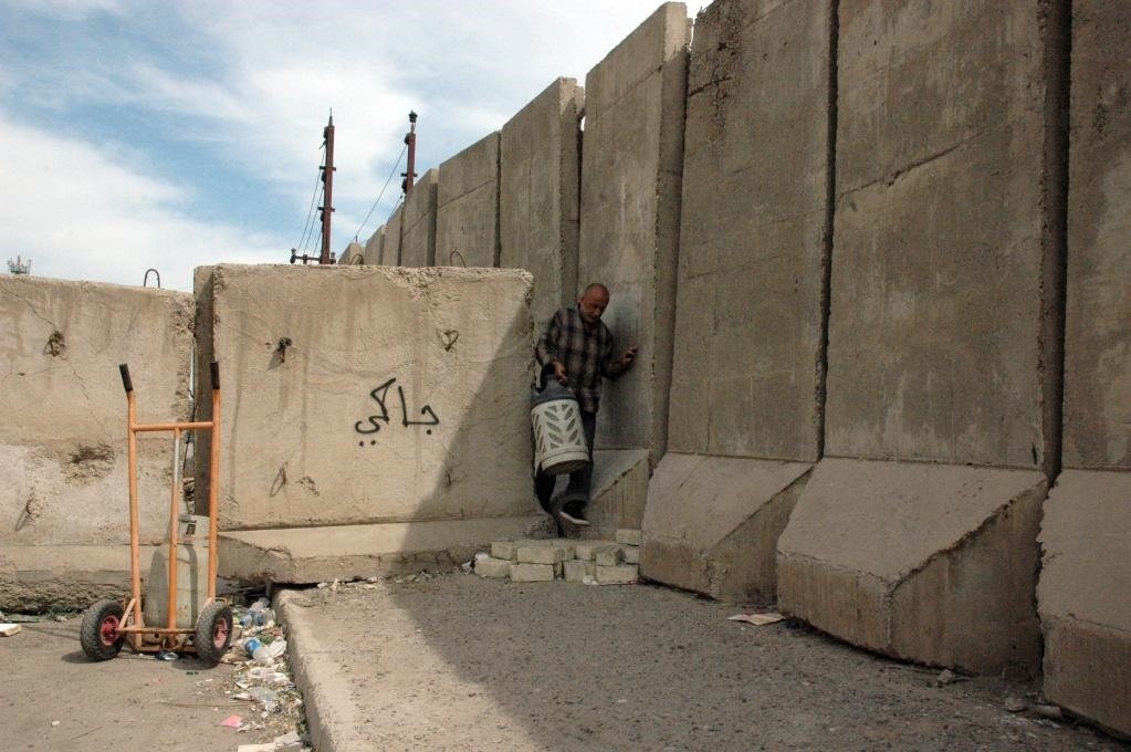 ?2013年3月20日,在伊拉克首都巴格達(dá),一名伊拉克人從防爆墻的縫隙之間穿過(guò)。新華社發(fā)(巴沙爾攝)