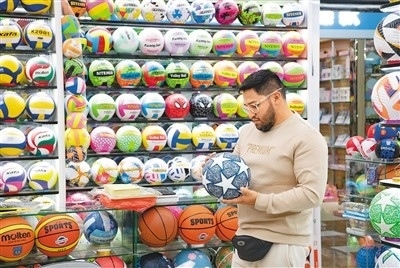 浙江省義烏國際商貿(mào)城,來自厄瓜多爾的外商在選購球類。時(shí)寬兵攝(人民視覺)