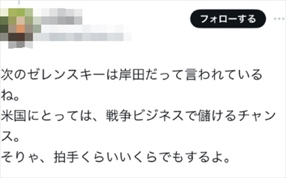 還有人說道:“有人說下一個(gè)澤連斯基是岸田。對(duì)美國來說,戰(zhàn)爭(zhēng)是賺錢的時(shí)機(jī),掌聲還是會(huì)給你的。”
