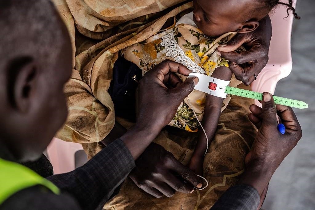 當(dāng)?shù)貢r(shí)間2024年2月13日,南蘇丹,在難民中轉(zhuǎn)中心的診所里,一名醫(yī)護(hù)工作人員在測(cè)量一名蘇丹兒童的手臂周長(zhǎng)。