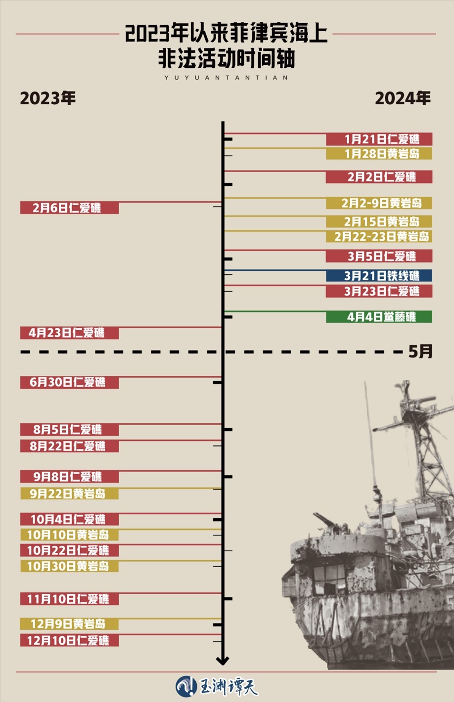 這是2023年以來(lái),菲律賓在南海挑釁滋事的時(shí)間線(xiàn),可以看到,在防務(wù)準(zhǔn)則更新后,菲律賓在南海挑釁滋事的頻次驟增。