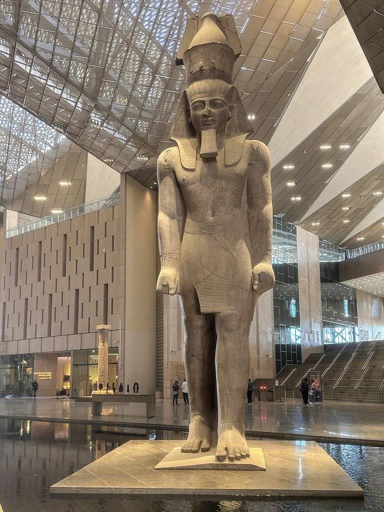 大埃及博物館蜿蜒于吉薩金字塔群側(cè)畔,場(chǎng)館將安置10萬(wàn)余件埃及文物。從史前到希臘-羅馬時(shí)期,按年代順序陳列。其中最大的展品包括位于中庭的一尊高11米、重75噸的拉美西斯大帝紅色花崗巖雕像和一艘45米長(zhǎng)的木制“太陽(yáng)船”,該船于1954年從胡夫金字塔底部坑穴發(fā)掘出土。