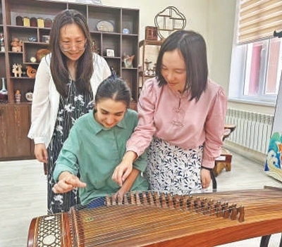 聯合采訪團隊塔方記者在孔子學院體驗古箏。本報記者 顏 歡攝